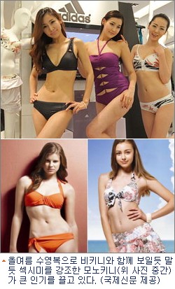 ◈ ''모노키니'' ''원숄더 비키니'' 한층 과감올여름 수영복으로 비키니와 함께 보일듯 말듯 섹시미를 강조한 모노키니(위 사진 중간)가 큰 인기를 끌고 있다. 몇년 전만 해도 비키니는 몸매 좋은 일부 여성의 전유물이었지만 이제 휴가지에서는 ''원피스 수영복''을 찾아볼 수 없을 정도다. 그만큼 비키니가 일반화됐다.