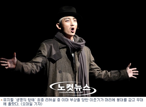 지난 21일 첫 공연을 앞두고 최종 리허설을 하던 중 암전 속에서 무대동선을 벗어나다 배의 철 구조물에 부딪쳐 이마에 부상을 입은 이준기가 24일 언론 시연회에 머리에 붕대를 감고 연기를 펼쳤다.