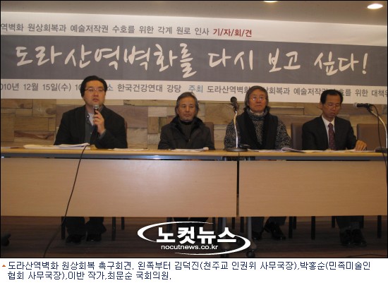 천주교 인권위원회와 한국민족예술인총연합 등 9개단체로 구성된 ''도라산벽화 원상회복과 예술저작권 수호를 위한 비상대책위''는 15일 오전 건강연대 3층강당에서 기자회견을 통해 공동성명을 발표했다.