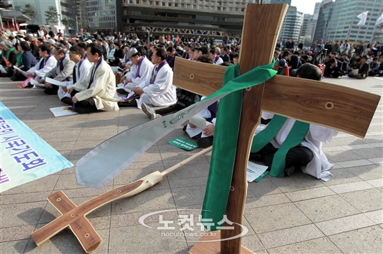 4대강사업 저지를 위한 범 종단 연대회의가 8일 오후 서울광장에서 4대강 되찾기 범 종단 성직자 선언 및 생명·평화 기도회를 갖고 있다.