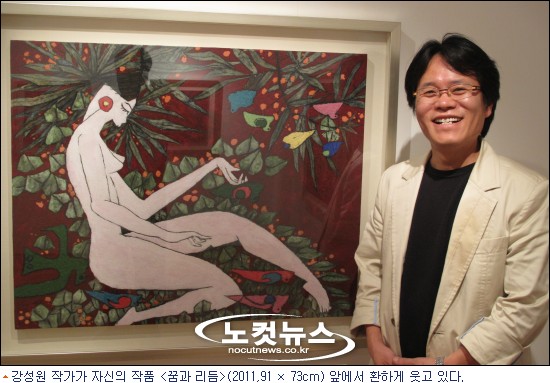 강성원 작가의 "천년의 몽환" 전시작품들은 그만의 특성을 지니고 있다. 호방한 윤곽선이 가장 두드러진다.그 굵고 호방한 윤곽선으로 표현된 여성이나 남성은 마치 신체의 특징만을 드러낸 목조각을 보는 것 같다. 다음은 유화보다 강한 색감을 띠면서도 동양수묵화처럼 번짐과 스며듬이 느껴진다는 점이다. 어떻게 이렇게 절묘한 조화가 가능할까? 그건 석채 재료의 사용에 있다. 천연광물안료인 석채를 입자가 가는 것에서 굵은 것까지(1-15호) 덧입히기를 하면 깊고 강한 색채가 나오고, 종이죽을 물에 풀어 그 위에 석채를 덮으니 먹그림처럼 번짐효과가 나오는 것이다. 강작가의 작품 윤곽선이 투박하면서도 자유로운 것은 벽화스타일을 따르는데 있다. 그는 "고구려 벽화나 돈황석굴 벽화, 고려 불화에서 제 작품의 착상을 했죠. 천연안료를 썼기 때문에 그 색채가 오랜세월동안 버티고 있는 것이죠. 벽화의 선묘가 투박한 것은 붓 대신 목탄을 썼기 때문이죠. 그 호방한 윤곽선이 제 작품에도 그대로 반영되었나 봅니다."라고 설명한다.