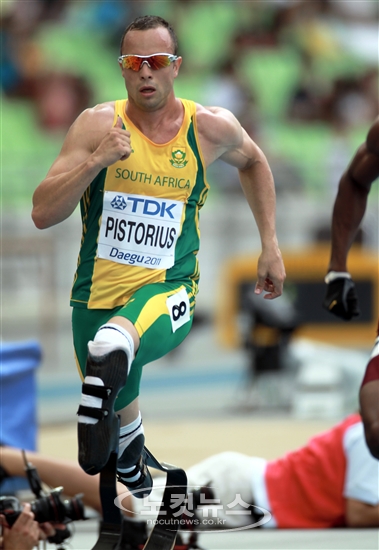 2011 대구세계육상선수권대회 둘째날인 28일 오전 대구광역시 수성구 대흥동 대구스타디움에서 열린 남자 400m 1라운드 경기에서 남아공의 ''의족 스프린터'' 오스카 피스토리우스가 트랙을 힘차게 달리고 있다.