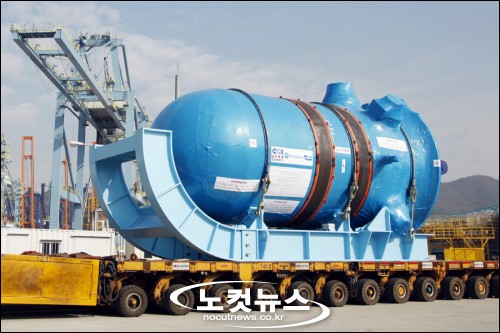 두산중공업은 4일, 경남 창원 공장 사내 부두를 통해 중국 산둥성 하이양 원자력발전소에 들어갈 신형 원자로를 출하했다.