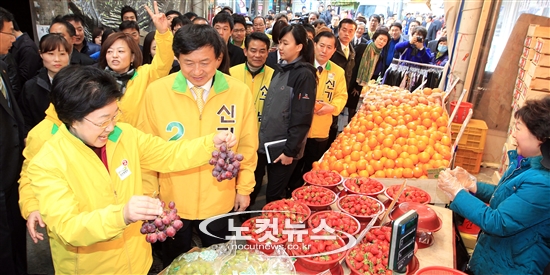 민주통합당 한명숙 대표가 8일 오전 강서구 화곡동 까지산 시장에서 강서갑 신기남 후보와 함께 유세를 펼치던 중 포도를 들이고 있다.