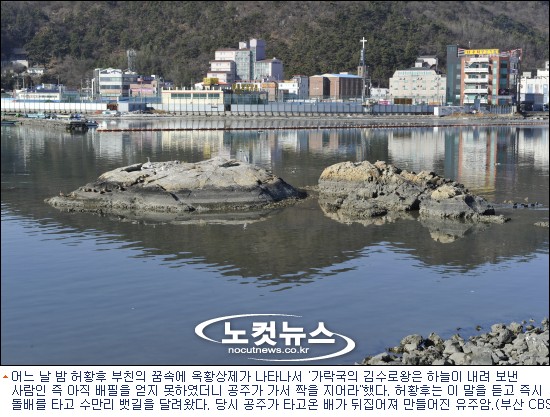 거북이 등껍질을 연상시키는 크고 작은 희귀한 암석과 잡목들이 옛날 허황옥이 물살을 가르고 찾아온 옛 가야의 역사를 나지막이 얘기해주는 듯하다.