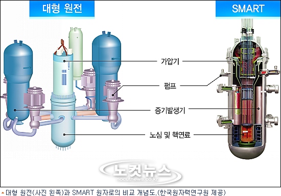 SMART는 국내 상용 원전과는 달리, 원자로 용기에 증기발생기와 가압기, 냉각재펌프 등 원자로 1차 계통 주요 기기들을 모두 하나의 압력용기 안에 배치해 안전성을 획기적으로 높인 일체형 원자로이다.