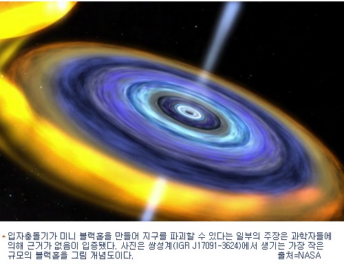 ◈ 지구를 삼키는 블랙홀물리학자들이 거대하드론충돌기(Large Hadron Collider, LHC)의 스위치를 연결했을 때 숨을 죽이며 초조하게 지켜보던 사람들이 있었다. 입자 가속기가 작은 블랙홀을 만들어 지구를 폭파할 것이란 유머가 수년 동안 떠돌아 다녔기 때문이다. 2008년 한 단체는 원자의 충돌이 지구의 종말을 초래할 수 있다며 입자 충돌 실험의 중단을 요구하는 소송을 제기하기도 했다.