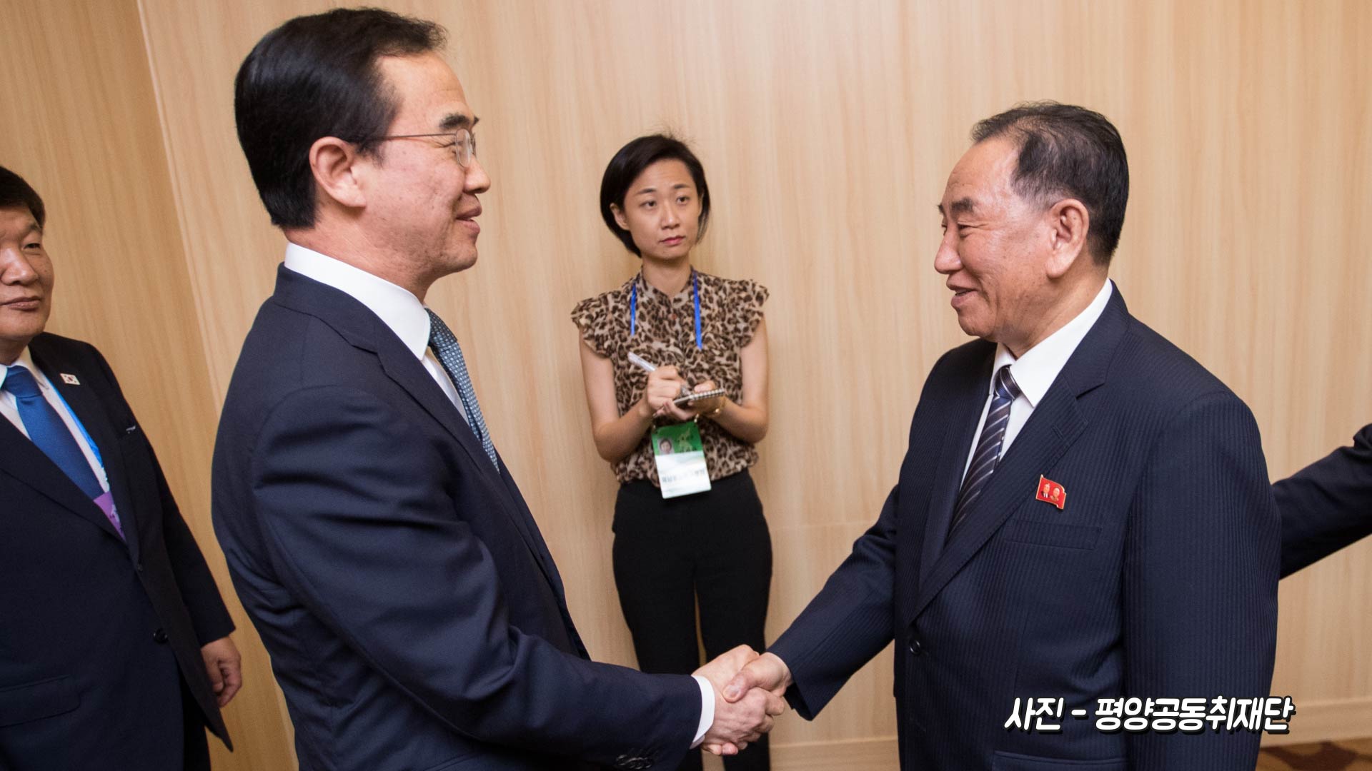 북한 김영철 노동당 부위원장이 5일 오전 고려호텔을 방문해 조명균 통일부 장관 등 남측 정부 대표단과 환담하는 자리를 가졌다.