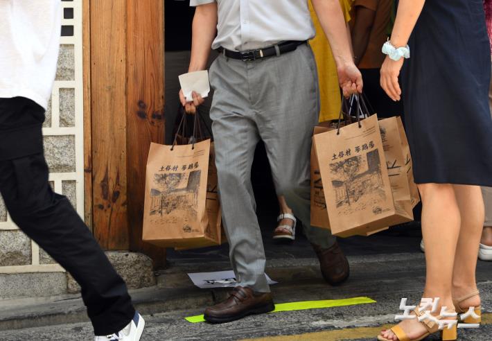 중복인 21일 오전 서울 종로구 한 삼계탕 전문점을 찾은 한 시민이 포장주문 한 삼계탕을 가져가고 있다.