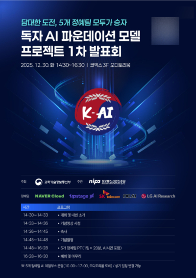 '국가대표 AI' 대국민 발표회 열린다…5개팀 성과 발표 2025.12.22 16:04