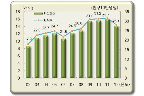 인구 10만 명 당 자살 사망률은 지난 2006년 21.8명으로 잠시 떨어졌다가, 2007년(24.8명) 이후 꾸준히 증가해왔고 2009년에는 30명을 돌파했다. 그리고 2011년에는 자살률이 31.7명까지 증가해 최고조에 달했다.