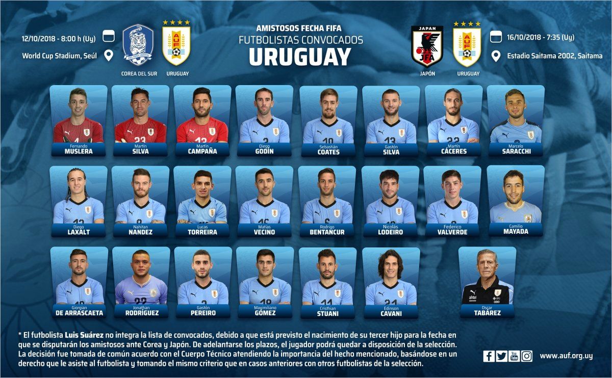 가장 관심을 모은 수아레스는 명단에서 빠졌다. 당초 무릎 통증으로 불참이 예상됐지만, 공식적인 이유는 아내의 출산이었다. 우루과이축구협회는 "개인 사정으로 명단에서 제외됐다. A매치 기간 동안 아내가 셋째를 출산할 예정"이라고 설명했다.