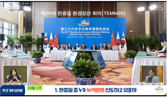 이런 얘기들도 오갔다고 해요. 양자 회의 같은 것도 열리잖아요. 그런데 한일 양자 회의에서는 일본이 올해 6월에 인공위성을 쏘아서 그 기상위성정보를 받게 되는데 그 정보를 혹시 공유할 수 있는지 제안이 오갔다고 해요. 그래서 어떻게 보면 한중일이 되게 가깝기 때문에 기후변화 대응 차원에서 기상 정보 같은 거 공유하는 협력도 이루어지지 않을까 하는 기대도 할 수 있을 것 같고요. 아무래도 한국, 중국, 일본 3국이 제조업 하면 진짜 세계 어느 나라 못지않은 경쟁력을 갖추고 있고 밸류체인을 다 갖추고 있잖아요. 그러니까 우리가 기후 대응이랑 탄소 저감 기술 경쟁에서도 입지를 지킬 수 있을지에 앞으로 동북아 기후랑 경제가 달렸다는 생각이 들었습니다.