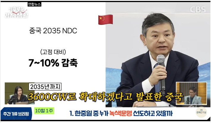 ◇ 최서윤> 네. 그래서 주목받고 있습니다. 실제 한중일 환경장관 회의에서도 황룬치우 중국 생태환경부 부장(장관)이 이번 2035 NDC 정책 발표를 전면에 내세웠습니다. 특히 스케일이 남달라요. 향후 10년 안에 비화석 에너지 비중을 30% 이상 확대하고 2035년까지 풍력과 태양광 발전 용량을 3,600GW(기가와트)까지 확대하겠다고 밝혔습니다.