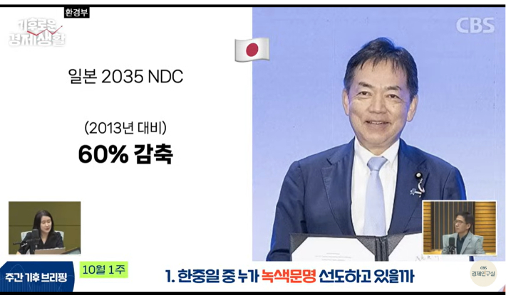◇ 최서윤> 네. 일본입니다. 우선 일본 기후 정책 가운데 지금 최대 현안이 하나 있어요. 내년부터 배출권 거래제(ETS)를 시행하거든요. 의무화하는 거예요. 우리나라가 2015년에 시작했기 때문에 우리보다 한 11년 정도 늦게 시작하는 거긴 합니다. 대신에 일본은 전환 금융 같은 다른 정책을 더 먼저 시작했어요. 그래서 일본의 기후 정책은 딱 들었을 때 중국하고 다르게 전반적으로 되게 야심찬 목표를 제시하기보다는 속도를 조절하면서 진행하고 있다는 분석이 많아요. 그런데 대신에 그걸 지켜가고 있다는 분석이 많은데요. NDC 같은 경우에 일본이 약속을 지켰어요. 올해 2월에 2035 NDC를 이미 제출했어요. 정점이 2013년인데 2013년 대비 60% 정도 감축하겠다고 목표를 세웠어요.