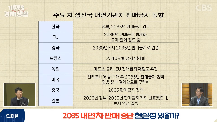 ◆ 홍종호> 이 모든 게 트럼프가 촉발한 자국 산업 우선, 국가 우선 흐름이 전 세계에 퍼져 있는 데서 비롯된 것 같아요. 특히 자동차는 핵심 산업이니까 예외가 아니고요. 이런 흐름 속에서 정부가 앞으로 2035년에 내연기관차 판매 제한을 검토한다는 얘기가 나왔는데요. 제가 제일 궁금한 건 우리나라 자동차 업계는 이에 대해 어떤 반응을 보이고 있냐는 겁니다. 이 얘기가 처음 나온 건 아니잖아요.