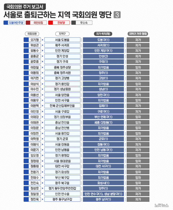한편 국민의힘 조지연 의원(경북 경산)과 민주당 이개호 의원(전남 담양·함평·영광·장성군)은 본인 지역구가 아닌 지역에 주택을 보유하고 있었다. 국민의힘 주진우 의원(부산 해운대갑)은 자가 주택 없이 서울 강남구 압구정동 아파트를 전세로 임차해 살고 있다.