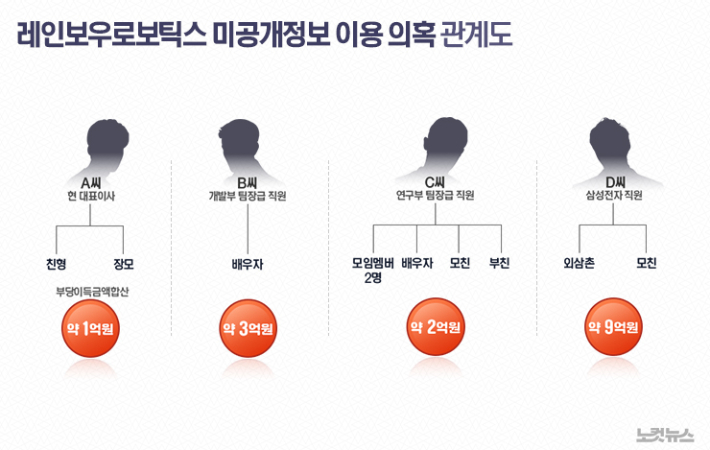 금융당국이 검찰에 접수한 고발장 등에 따르면, 레인보우로보틱스 대표이사 A씨의 장모와 친형은 해당 기간 주요 정보가 공개되기 직전 회사 주식을 사고 팔아 수천만 원에서 1억 원 넘게 이득을 본 것으로 조사됐다. 두 사람은 주요 이벤트 정보 공개 전 매수, 정보 공개 직후 매도하는 매매 양태를 보였는데, A씨로부터 미공개정보를 받아 부정한 거래를 한 의혹을 받고 있다.