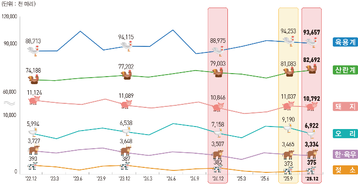 닭 사육 늘고, 소 ·돼지는 감소 …산란계, 8200만마리↑ '역대 최대' 2026.01.23 12:00